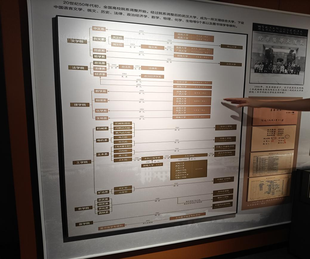 本次讲解工作由校史馆学生讲解员、同时也是支部成员的何承骋同志亲自担任。讲解过程中,他依托深厚的历史知识储备与专业的讲解素养,结合校史馆实物与图文资料,以清晰的逻辑脉络,将武大的历史故事生动呈现。他带领大家回溯了学校的选址、建筑和学科发展历史,还特别聚焦抗战时期西迁乐山的艰难岁月,讲述了师生在战火纷飞中坚持教学科研、以笔为枪投身救国的感人事迹。何承骋同志的深情讲述使在场成员如临其境,沉浸式地体悟那段峥嵘岁月。