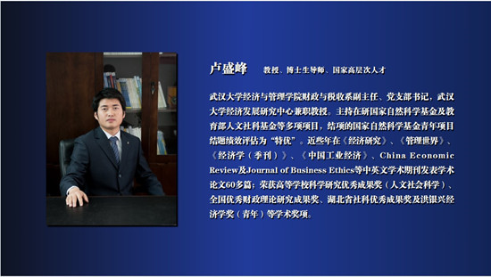 经济发展研究中心兼职教授。主持在研国家自然科学基金及教育部人文社科基金等多项项目,结项的国家自然科学基金青年项目结题绩效评估为“特优”。近些年在《经济研究》、《管理世界》、《经济学(季刊)》、《中国工业经济》、China Economic Review及Journal of Business Ethics等中英文学术期刊发表学术论文60多篇;荣获高等学校科学研究优秀成果奖(人文社会科学)、全国优秀财政理论研究成果奖、湖北省社科优秀成果奖及洪银兴经济学奖(青年)等学术奖项。有请卢盛峰教授。