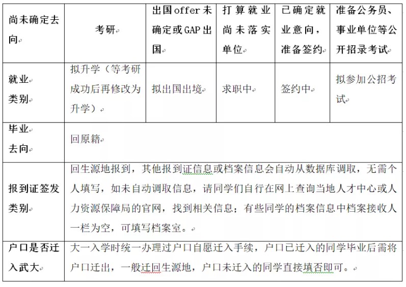 尚未确定毕业去向的同学:未确定去向的学生须按照就业信息系统的待就业类别填写毕业去向,不影响后期网签或其他去向登记。