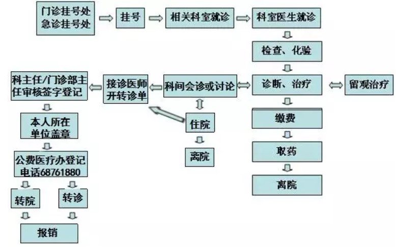(1)平诊患者转诊:接诊医师开出的转诊单,需由科主任或门诊部主任签字登记、公费医疗办审核登记盖章(若联网,也可通过电话向公医办登记),本人所在单位盖章后方可转诊。