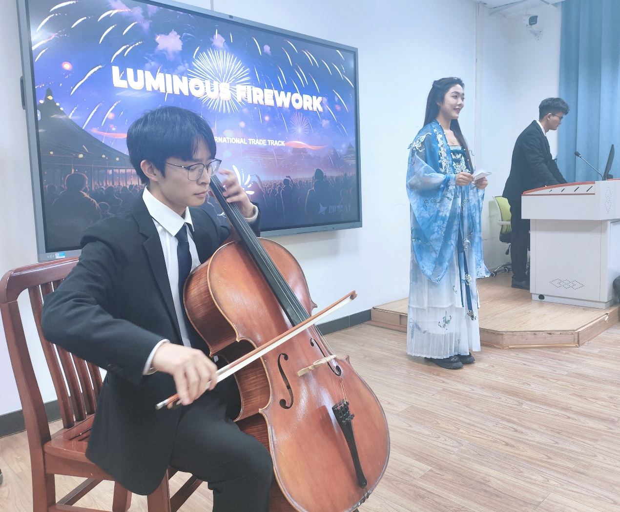 随后的新产品发布会环节则更具创意与挑战性。各队伍需选择一款创新产品,并模拟企业发布会场景,通过英文演讲、多媒体展示及现场互动,向评委和观众推介产品。从浏阳烟花到科技玩具,参赛作品紧扣全球贸易热点,充分体现了海棠书屋