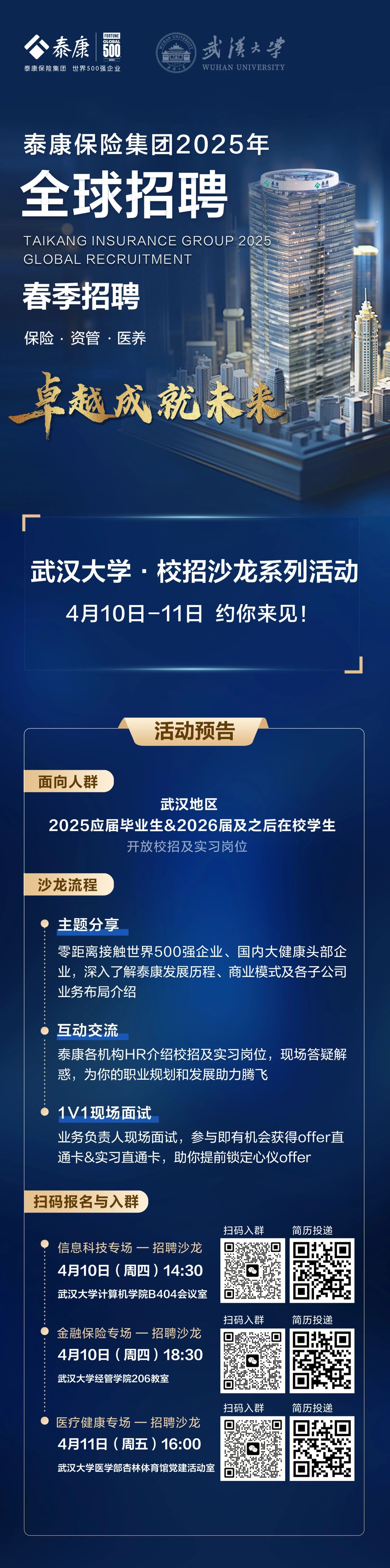泰康集团总部携旗下业务板块共同参与,现场释放保险、医养、信息科技类校招和实习岗位机会,以及泰康基金面向武大定向招聘岗位。工作地点分布武汉、北京及全国业务布局地区。现场进行1v1面试,面试通过即有面试直通卡、实习直通卡、offer直通卡放送!欢迎各位同学参加并转发信息!